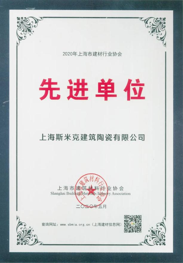 2020年5月,,,,,,,,凭证《上海市建材行业协会先进单位评定治理步伐》,,,,,,,,经行业专家评审,,,,,,,,上海97国际修建陶瓷有限公司被评为2020年上海市建材行业协会先进单位。。。。。