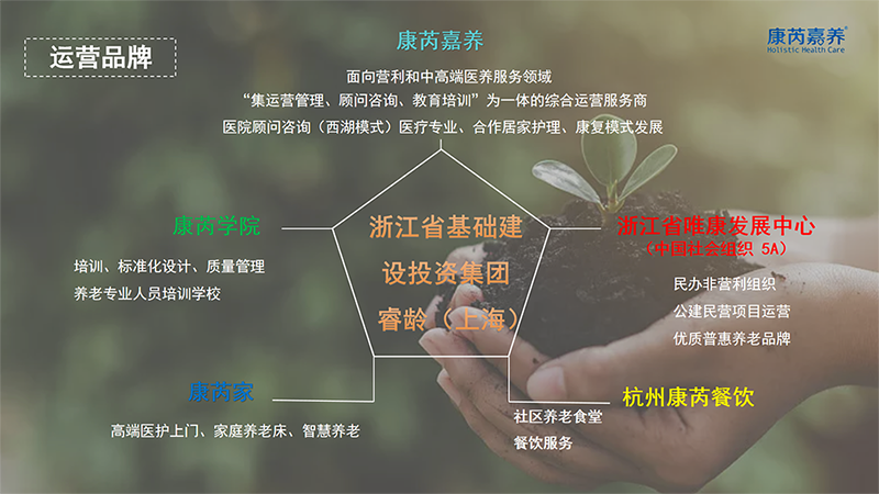 浙江康芮嘉养康健治理有限公司建设于2017年10月,,,,,由浙江省基础建设投资集团和台湾独资睿龄(上海)康健治理咨询有限公司配合组建,,,,,融合两岸医养优势资源,,,,,多元化生长“医、养、护、教、E”五位一体的大康健工业,,,,,是“集运营治理、照料咨询、教育培训”为一体的大康健综合运维服务商。。。。。。。。营业规模笼罩浙江省的杭州、宁波、绍兴、湖州、台州和丽水,,,,,以及河北省的衡水等地,,,,,现共有运营服务单位58家,,,,,居家上门服务逾8000户,,,,,累计相助运营治理的医养护机构床位逾4000张。。。。。。。。浙江康芮嘉养旗下唯康品牌建设于2004年,,,,,浙江省唯康生长中心获评浙江省中国社会组织评估品级AAAAA,,,,,拥有浙江省第一家公建民营养老机构,,,,,涵盖养老机构、照顾护士院、互联网+养老、认知症专区、日间照料中心、“三位e体+”居家上门服务、社区食堂等多个营业板块,,,,,实现多层级多元化的优质服务,,,,,获得社会公共一致好评。。。。。。。。